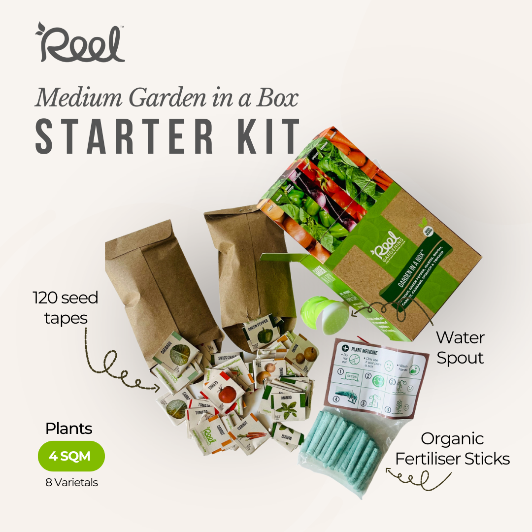 The Medium Garden in a Box offers a complete solution for growing a diverse vegetable garden over 8 square meters. It includes 8 vegetable varieties—onion, marog, green pepper, beetroot, tomato, spinach, cabbage, and carrot—with 15 seed sachets each, totaling 120 sachets. The kit also provides 15 fertiliser sticks and a water spout that converts any old cooldrink bottle into a practical watering can. Seeds can be planted in containers at least 20cm deep with good drainage or directly in soil, requiring full sunlight and daily watering for optimal growth.
